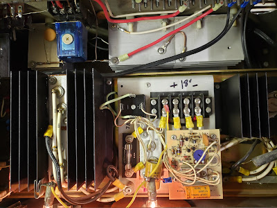 This is a 60A regulated linear power supply for Studio B. I needed a large power supply to run various radios on Studio B, from time to time. Since I'm a tightwad, I typically repair or build things like this. I had an old 18vdc unregulated supply from a RCA Series 1000 repeater, so that was a good start. I also had a 60A dc regulator deck I built about 30 years ago for another project. I started looking about for a cabinet to put all of this stuff into...and I spotted the carcass of a 1940 Hallicrafters SX-25 radio. It was from a junker I bought for parts to restore other radios. It was pretty beat up, but dimensionally capable of housing all of the parts. I hauled the case out back and beat the dents out (along with lots of rust scale and other stuff). I fitted the 18v supply, and the 60a regulator into it (barely!). I installed 1/4" dia bolts through the holes where the knobs should be, and installed the knobs. I patched up the broken dials and installed them inside of the dial bezels with alien tape. The s-meter was just a shell, but I found an old magnavox meter bezel and lens that matched the dials in color, and installed them. I reinstalled all of the old switches I could find and fit, and installed a digital volt meter in the s-meter housing. I was able to straighten and reuse the original cabinet vents, and flip top cover. So, it looks like an old SX-25, but has more modern solid state electronics. It fits right in with some of my older gear. Have a look...